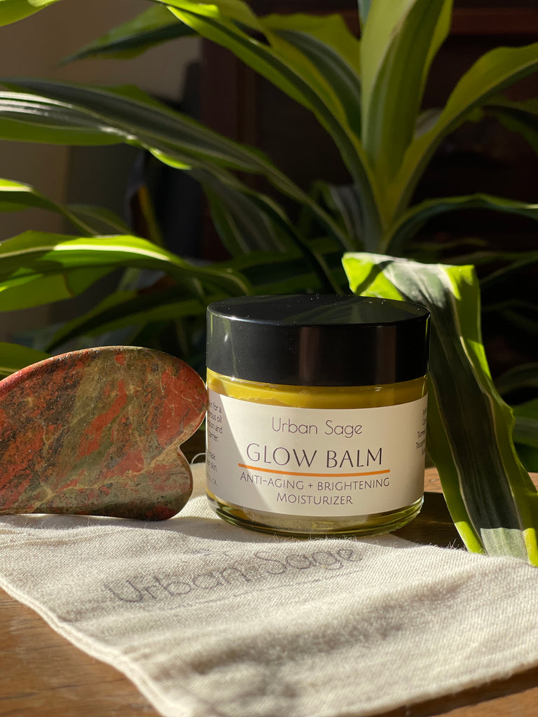 The Glow Balm is a hyper-potent golden brightening moisturizer that is water free. This will give a continuous glide for the Gua Sha tool while also deeply delivering nutrients to the skin.